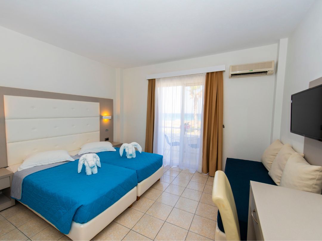 L’hotel dispone di 47 confortevoli camere, completamente rinnovate ed elegantemente arredate, con vista sul mare o sulle piscine e sul giardino, che possono ospitare fino a 3 persone.
