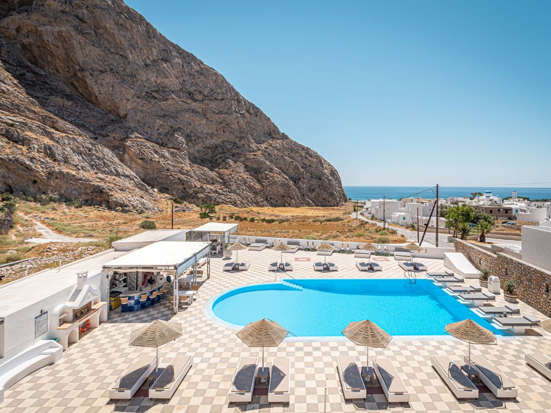 La spiaggia di Perissa Beach, caratterizzata da ghiaia e ciottoli, dista circa 500 metri dall’hotel. Il mare limpido e la lunga distesa costiera la rendono ideale per giornate di relax e passeggiate sul lungomare.